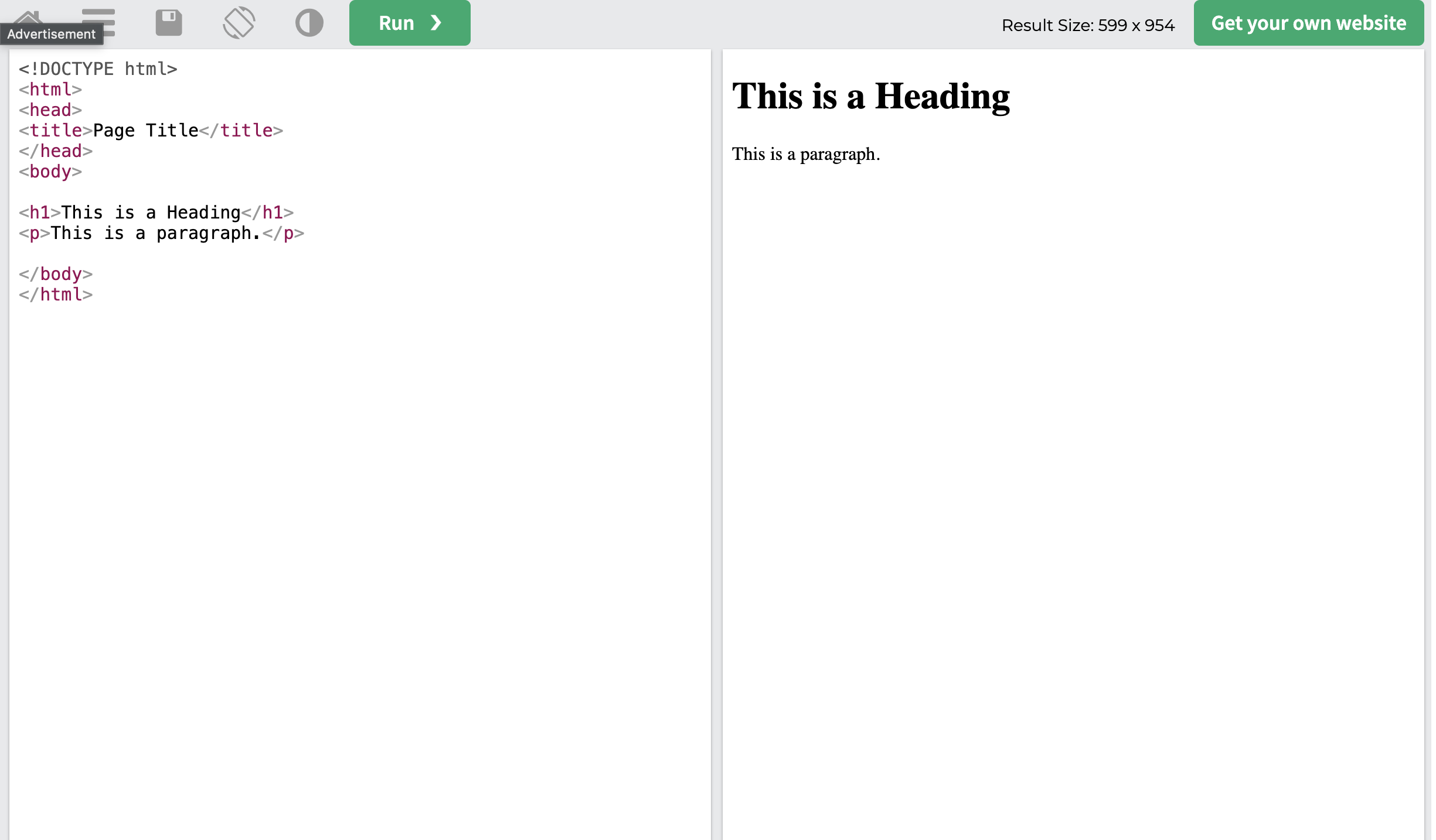 Editor: Link: https://www.w3schools.com/html/tryit.asp?filename=tryhtml_basic_document
